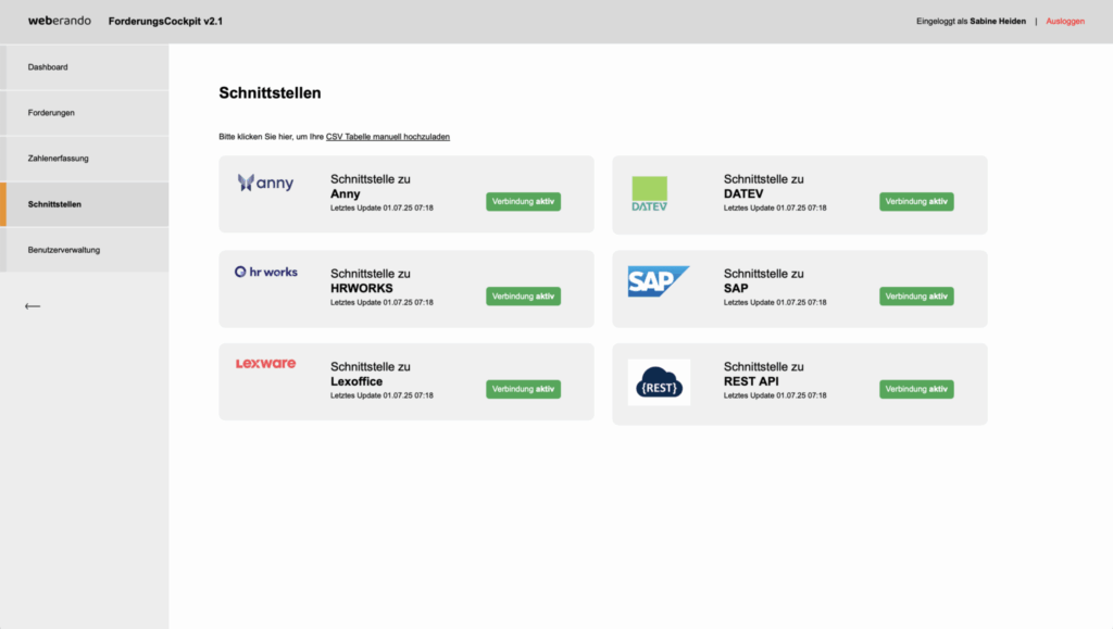 Übersicht über offene Posten, Fälligkeiten, Mahnstufen – direkt aus Ihrer Buchhaltung oder per CSV-Datei.