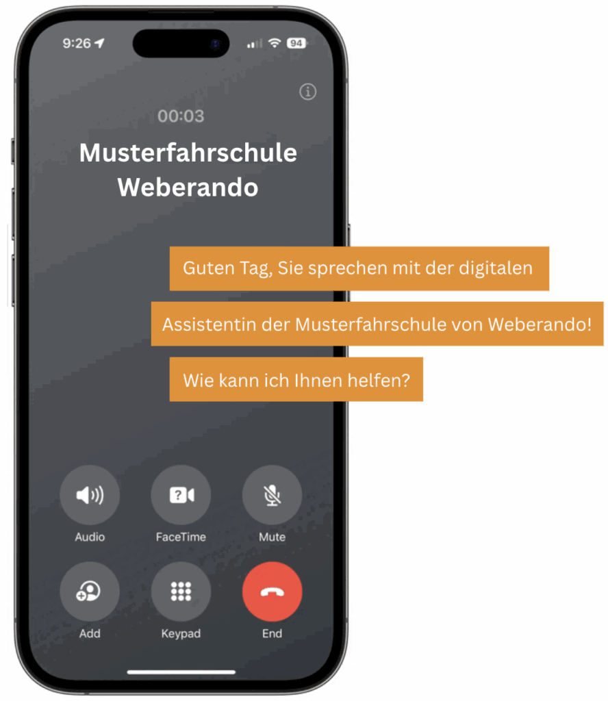 Ihre KI telefoniert freundlich, zuverlässig und fehlerfrei – während Sie sich auf Unterricht, Fahrstunden und Ihr Tagesgeschäft konzentrieren.